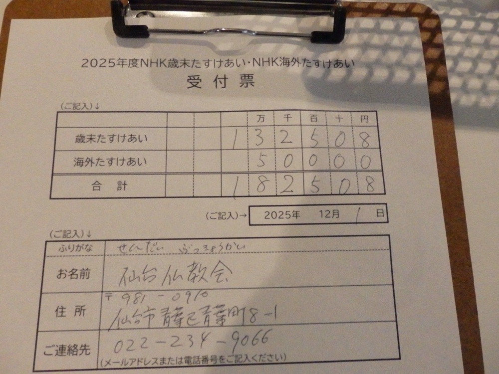 托鉢後、NHK仙台放送局に行き、会員様から事前に頂いた募金と、托鉢募金をお持ちしました。